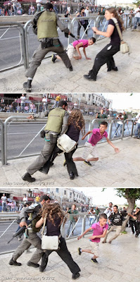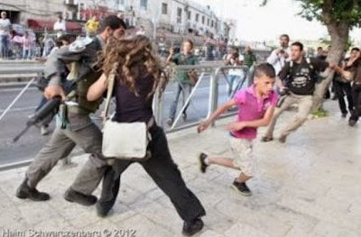 Seorang wanita Yahudi Israel telah bertindak diluar pemikiran akal logik manusia masa kini, mempertaruhkan maruah dan nyawanya sanggup pertahankan nyawa seorang budak warga Palestine dari terus dibelasah oleh seorang askar Yahudi Zionis Israel.